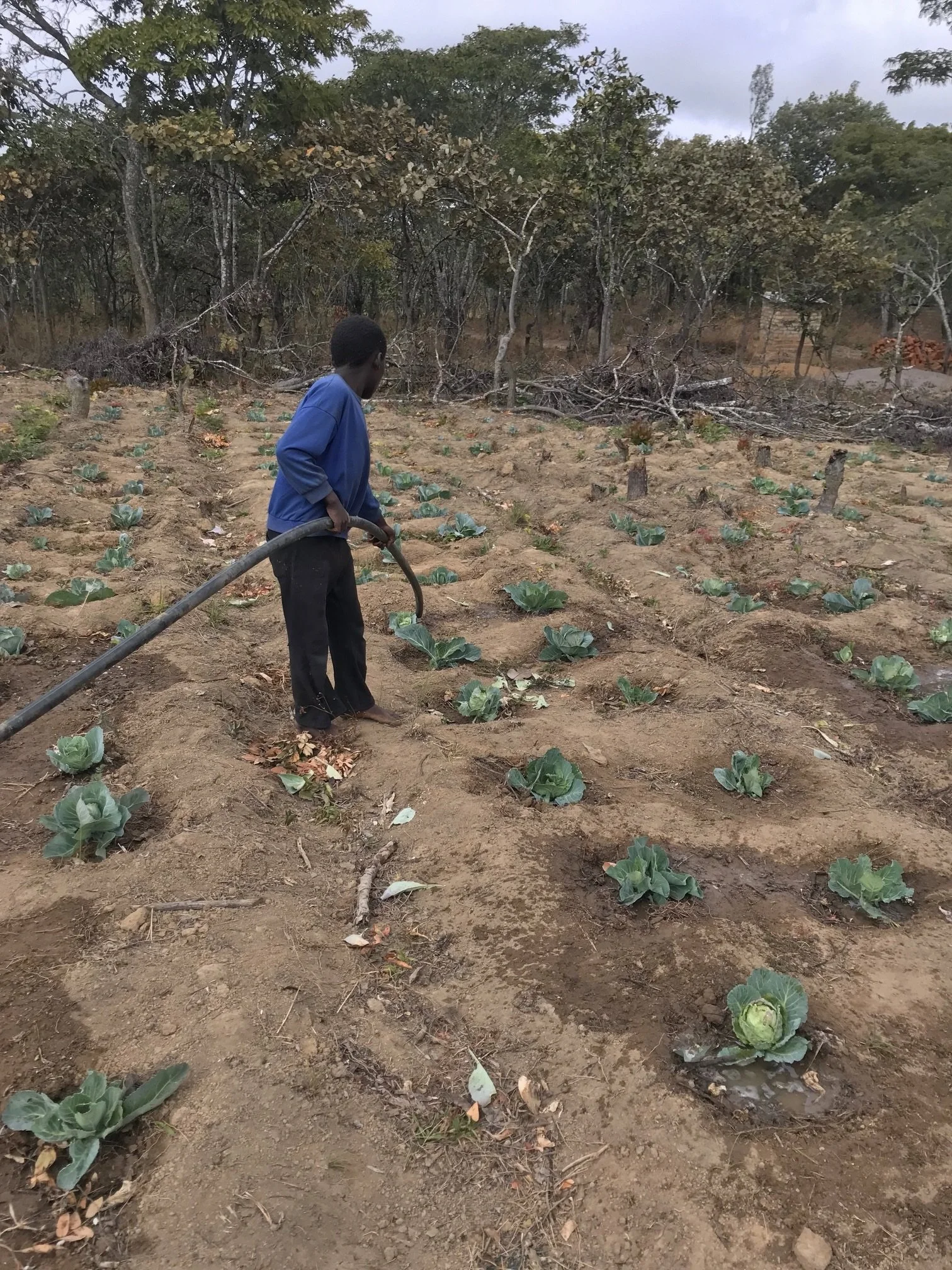 One of the pupils at the school waters cabbages in the school garden, July 2025.